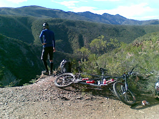 Highlights of the trip for me were riding across the top of Black Fountain on those brilliant singletracks; relaxing at Slaapkranz after a short day’s riding (with Andre the farmer and his dog Jesse); the day after Stuttgart when we just managed to sneak over Struishoek as it was getting dark (great nav. Mike) and our 2nd last day riding from Montagu to Trouthaven, when we were joined by Steve and the entertaining duo of Marnitz and Carl. Actually there were many more highlights along the way, every day had its moments. There were moments of bleakness too: the long, dark and freezing cold night riding into Chesneywold; those old railway tracks before Brosterlea; the toothache at Romansfontein, the sore knees from pushing big gears; fixing a puncture in the freezing rain; the seemingly endless sandpits around Anysberg…..